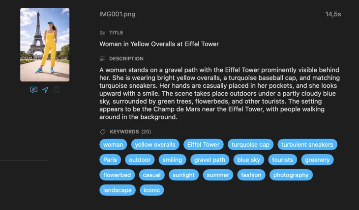 VisionTagger uses on-device AI to generate titles, descriptions, keywords, and more for your images — in bulk, with no uploads and no per-image fees.