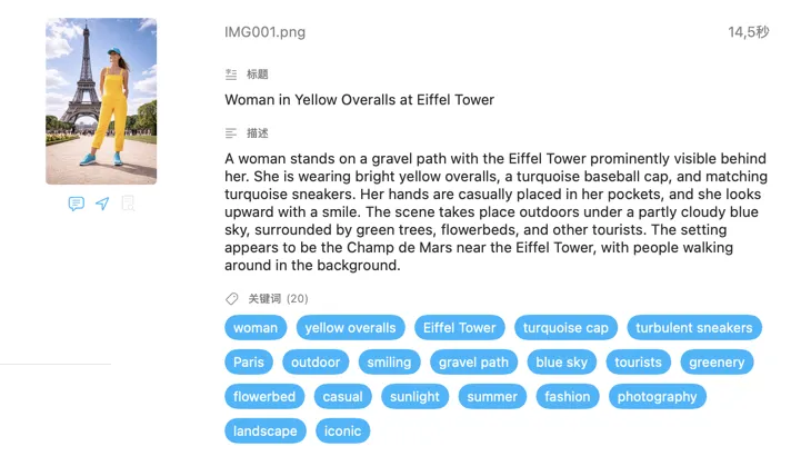 看结果实时出现。VisionTagger 在本地处理图片,并在每个项目准备好时立刻把生成的元数据流式写入一个可滚动列表,这样批处理还在继续时,你也能一边查看、一边编辑输出。